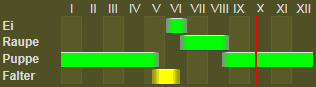 Die Raupe - Sp. IV, T 13 - lebt von Juni bis September an Galium und Asperula. - Aus im Frühjahr erhaltenen Eiern schlüpften die Räupchen im Zimmer am 15. V. 1903, sie wurden mit Galium verum gefüttert und frassen nur des Nachts. Ende August waren sie erwachsen und verwandelten sich in einem mit Haaren und Erde vermischten Cocon zur Puppe. Im Februar in das warme Zimmer genommen, ergaben sie die Falter von Ende des Monates ab.