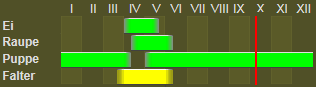 Lebenszyklus: Flugzeit während der Blüte und Blattknospenentfaltung von Stiel- und Traubeneichen. Flugzeithöhepunkt im letzten Aprildrittel. 1 Gen./Jahr. Die Puppe überwintert nur 1x. Der Falter kommt gern ans Licht. Tagesruhe an hohen Eichenzweigen.