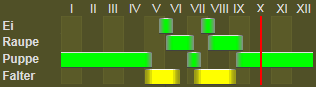 Lebenszyklus: Ein- bis zweibrütig. Partielle 2. Generation von Ende Juli bis Mitte September.