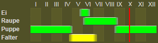 welche in feuchten Sand gesteckt und täglich erneuert wurden. Als Zwinger diente ein Gazekasten, auf dessen Boden Erde und Moos vorhanden waren; derselbe stand im Freien am Schatten. Ende August bis anfangs September erfolgte die Verpuppung in der Erde, wo die Puppen im Freien überwinterten. Ein Teil der Falter erschien im Mai - Juni des folgenden Jahres, einige Puppen überlagen aber 4-5 Jahre lang, ehe diese schlüpften. E. Sp. n, 101 - 111. Zeitschr. f. Ent. IV, 167 - Favre 256 - Soc. Ent. IX, Nr. 3 - B. R. 399.