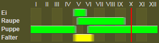 Ebene aber an Pappeln, Erlen, Eichen, Birken und deren Flechten. Die Puppen der Herbstbrut überwintern in einem lockeren Gespinst unter Moos an der Erde. E. Sp. II, 93 - Roug. 183 - Favre 250 - Frio. III, 32 - B. R. 390 - Lamp. 257, T 73 - Schmett. Westf. 128.