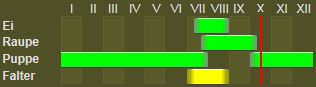 Lebenszyklus: Die Puppe überwintert, in Jahren mit trockenem Frühjahr 2x.