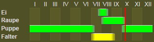 Raupe sehr schlank, grün, braun oder purpurrot.