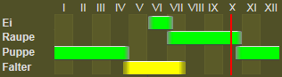 Die Raupe - Sp. IV, Nachtr. T VIII - lebt von August bis Oktober an Pinus silvestris; bei Bern, Biel, Burgdorf und Signau (ausschliesslich?) an P. strobus; in den Alpen auch an Larix decidua (Simplon, Rätzer, V.) und angeblich in der Umgebung von Genf an Abies alba. - Die bläulichgrünen Eier werden im Mai - Juni, im Gebirge später, in die Rinnen der Nadeln abgelegt. Die Räupchen schlüpfen nach 14 Tagen und leben meist oben in den Wipfeln der Bäume. Vor Einbruch des Winters steigen sie herab und verkrieche»