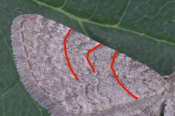 Bei einigen Tieren erscheinen die Querlinien, die das Mittelfeld einfassen, dunkel und deutlich. Diese Tiere haben auch einen feinen Mittelpunkt, der sonst fehlt.