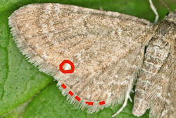 Flügelfarbe braun, weisser Fleck am Innenwinkel