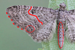 Abdomen grau bis graubraun, oft schwach rötlich getönt, schwarze laterate Punkte oder Streifen.