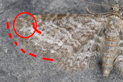 Fransen aller Flügel fein hell- und dunkelgrau gescheckt.