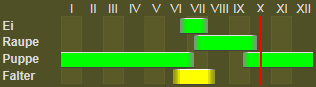 Lebenszyklus: 1 Gen./Jahr. Flugzeithöhepunkt, wenn die Veratrum-Pflanze Blütenknospen zeigt. Die Puppe überwintert oft mehrmals.
