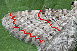 Zahlreiche hellgraue Wellenlinien durchziehen den Vorderflügel, wobei das Basalfeld ausgespart bleibt.