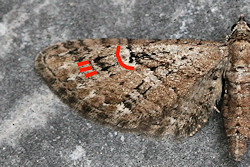 Der strichförmige schwarze Mittelfleck ist meist von einem weissen Hof umgeben.