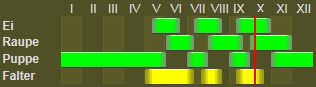 T 62 - B. R. T 46. Diese Art ist von der Ebene bis in etwa 1500 m Höhe weit verbreitet und nirgends selten. Flugzeit im April - Mai und von Juli bis September.