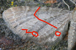 Im dunkleren Saumfeld eine durchgehende punktförmige, weisse Wellenlinie, im Innenwinkel in Feld M2 ein kleines, markantes Fleckchen.