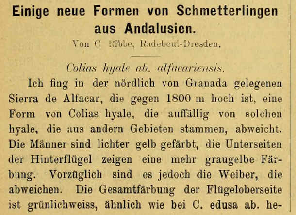 REISSINGER hat von Colias alfacariensis oben erwähnte Unterarten beschrieben, die von VERHULST 2000 (in: Colias of the World) mit Colias alfacariensis synonymisiert worden sind.